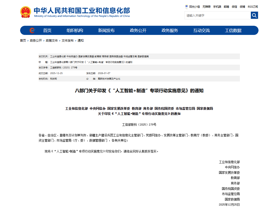【行業(yè)動(dòng)態(tài)】八部門聯(lián)合發(fā)布《“人工智能+制造”專項(xiàng)行動(dòng)實(shí)施意見》
